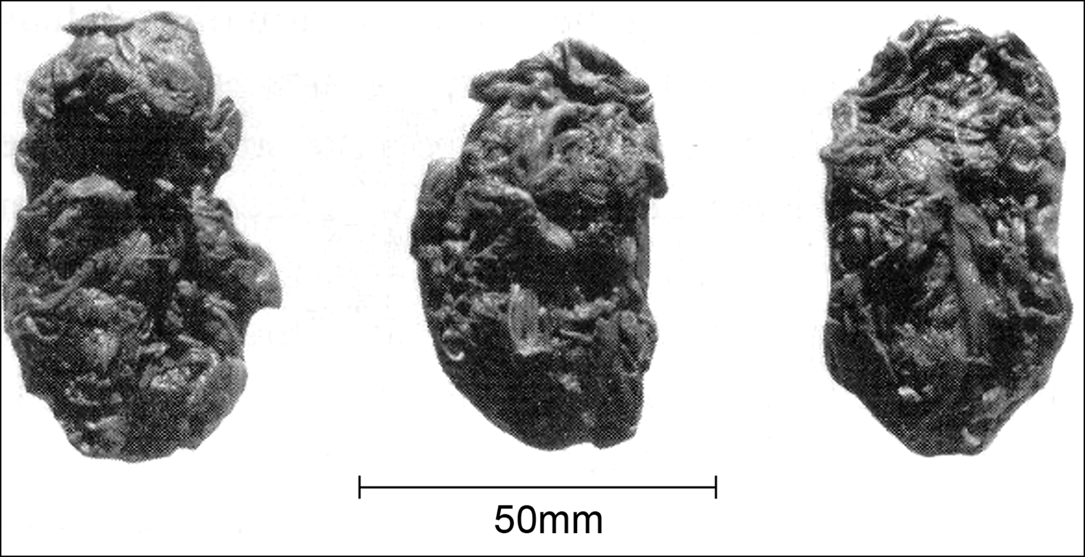 Figure 5. Three masticated cuds from MV-II, containing three to four varieties of marine seaweeds and boldo, a terrestrial plant, known ethnographically for their medicinal purposes. Note probable tooth impressions (photograph by T. Dillehay).