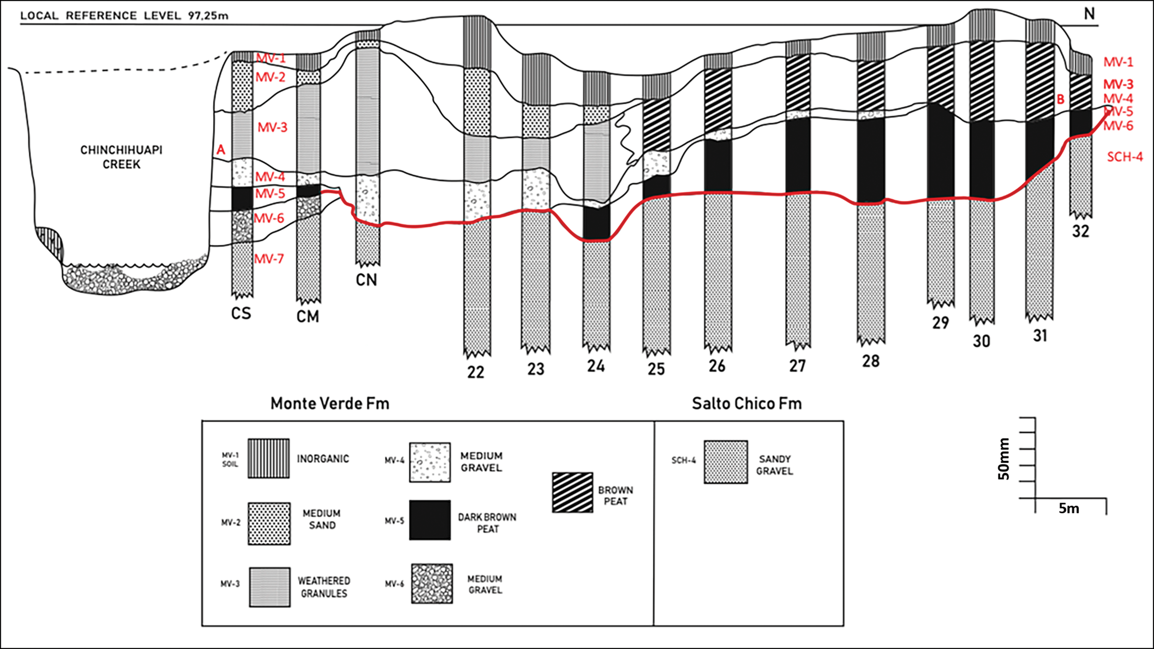 Figure 6. Stratigraphy of the north–south trench (T-3; Pino Reference Pino and Dillehay1989). Section A corresponds to the locus typicus of the Monte Verde Formation (MVF); Section B is near both the Pino (MV-86b) and Taylor cores. The red line indicates the buried MV-II occupational surface. Redrawn after Pino (Reference Pino and Dillehay1989) (figure by M. Pino).