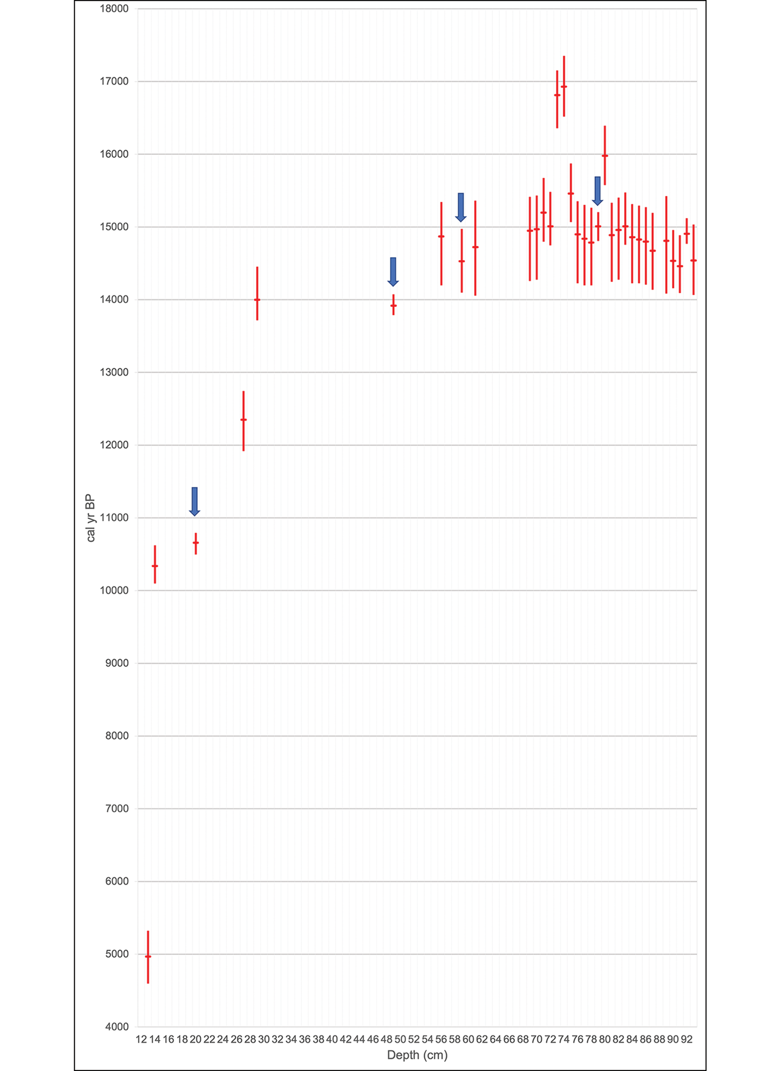 Figure 7. Relationship between the probabilistic median and range and the depth. The blue arrows indicate the position of the four MV-86b dates. The median age value distribution appears to form a curve with two different slopes—that is, two different sedimentation rates (see the online supplementary material) (figure by M. Pino).