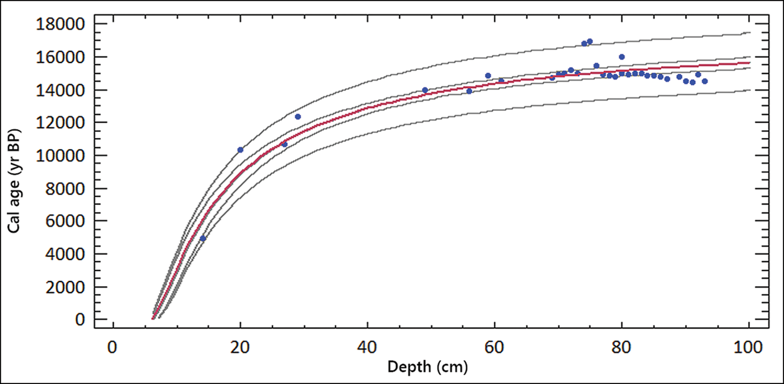 Two groups of dates are apparent in the two cores. The first is composed of six radiocarbon dates between 4970 and 13 920 cal BP (at 95.4% probability), including one outlier of 14 000 cal BP at a depth of 0.49–0.50m. The second group includes 27 dates between 14 530 and 15 010 cal BP (at 95.4% probability), with a mean of 14 855±221 cal BP, including three outliers with a median age of c. 16 000–17 000 cal BP (at 95.4% probability) at a depth of 0.74, 0.75 and 0.80m. The spread shown at 94.5% probability is so narrow that most of the 27 radiocarbon ages are indistinguishable from each other (see Figure 7). The deposition rates in the first and second groups are around 0.05 and 0.30mm per year (see the OSM). Figure 8 shows the modelled age, with the three outliers in the regression model, at depths of 0.20, 0.74 and 0.75m, having more than two standard deviations with respect to the observed calibrated ages in the model, being between 1454 and 1950 years older than expected. Further detail concerning the calculations behind this model are given in the OSM.
