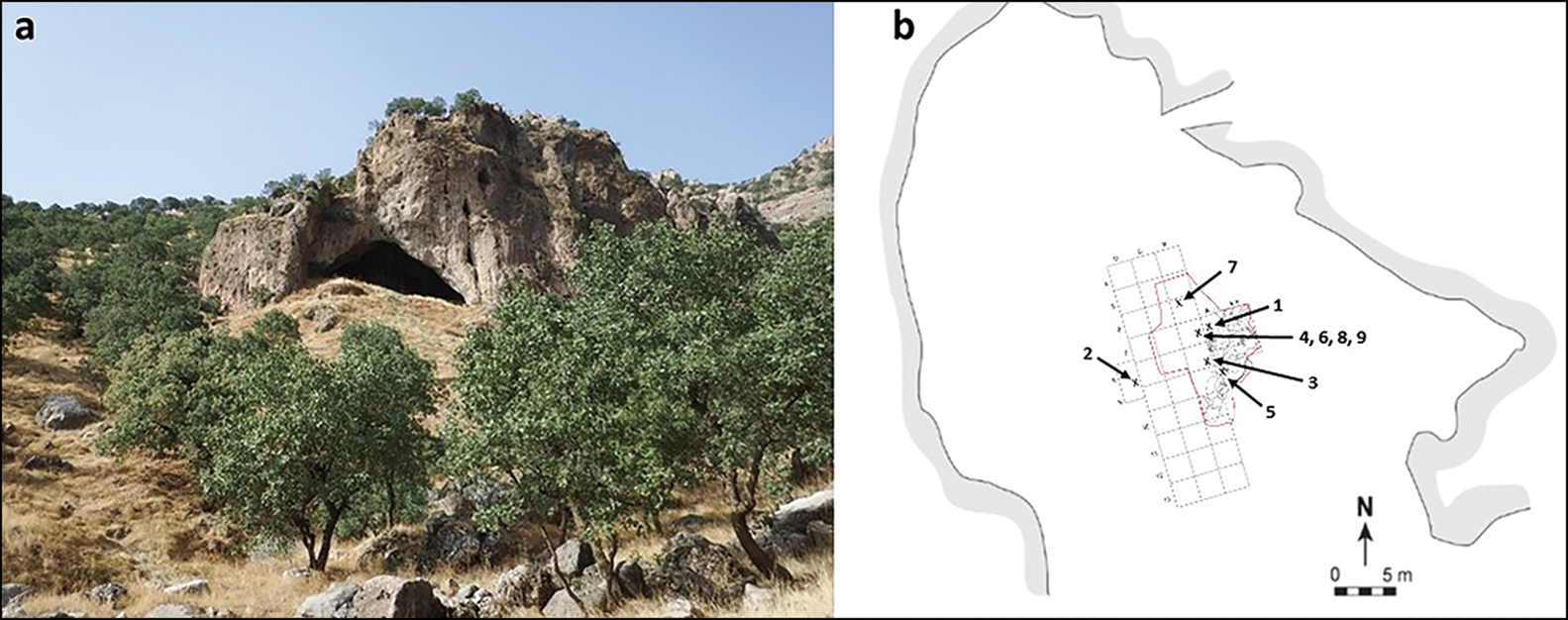 Shanidar Cave is a large, south-facing, karstic cave located at around 750m asl in the foothills of the Baradost Mountains of north-east Iraqi Kurdistan (Figure 1a). Between 1951 and 1960, Ralph Solecki dug an approximately 20 × 6m trench, oriented roughly north–south, in the centre of the cave floor. At its deepest point, the trench reached 14m below the ground surface (Figure 1b). Below the Epipalaeolithic and Upper Palaeolithic (‘Baradostian’) occupation levels, Solecki discovered, at a depth of 4–7m, the skeletal remains of 10 Neanderthal men, women and children (Trinkaus Reference Trinkaus1983; Cowgill et al. Reference Cowgill, Trinkaus and Zeder2007)—a unique assemblage that justifies the site's iconic status in Neanderthal archaeology (Solecki Reference Solecki1955, Reference Solecki1960, Reference Solecki1961, Reference Solecki1963, Reference Solecki1971). Solecki argued that while some of the individuals had been killed by rocks falling from the cave roof, others had been buried with formal burial rites. The latter group includes Shanidar 4, the famous ‘flower burial’, so-called because clumps of pollen grains from adjacent sediments were interpreted as evidence for the intentional placement of flowers with the corpse (Leroi-Gourhan Reference Leroi-Gourhan1975; Solecki Reference Solecki1975).