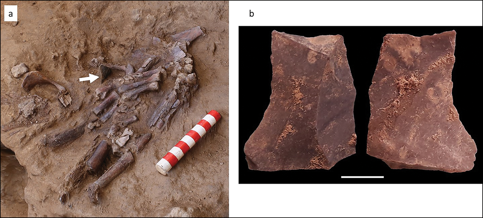 Figure 7. a) The lithic (indicated by white arrow) sitting inside the curvature of the first left rib and near the left hand of the new Neanderthal remains; looking north-east; scale = 0.10m (photograph by R. Lane, from photogrammetry model of the excavations); b) detail of the lithic, scale = 10mm (photograph by T. Reynolds).