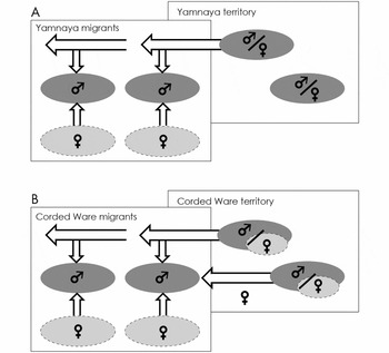 Figure 1. Model of the social processes of exogamy transforming Yamnaya to Corded Ware Culture, and its subsequent migration as Corded Ware Culture leading to further adaptations and transformations.