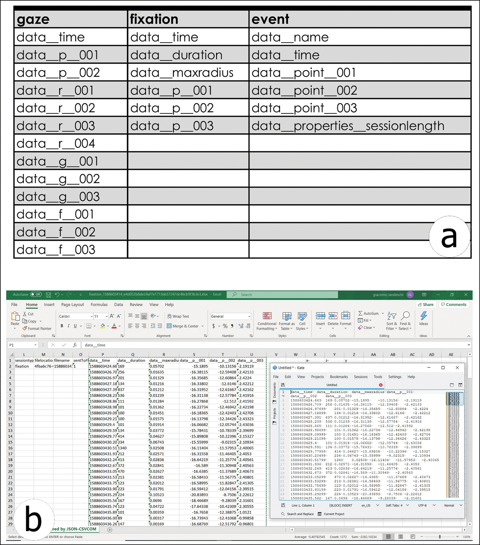 Figure 4. JSON datasets exported from Cognitive3D, containing results of a single user's visual experience (a). Eye-tracking-derived datasets are edited with a text editor in order to adjust x,y,z column placements, according to the ArcGIS PRO combination scheme (b).