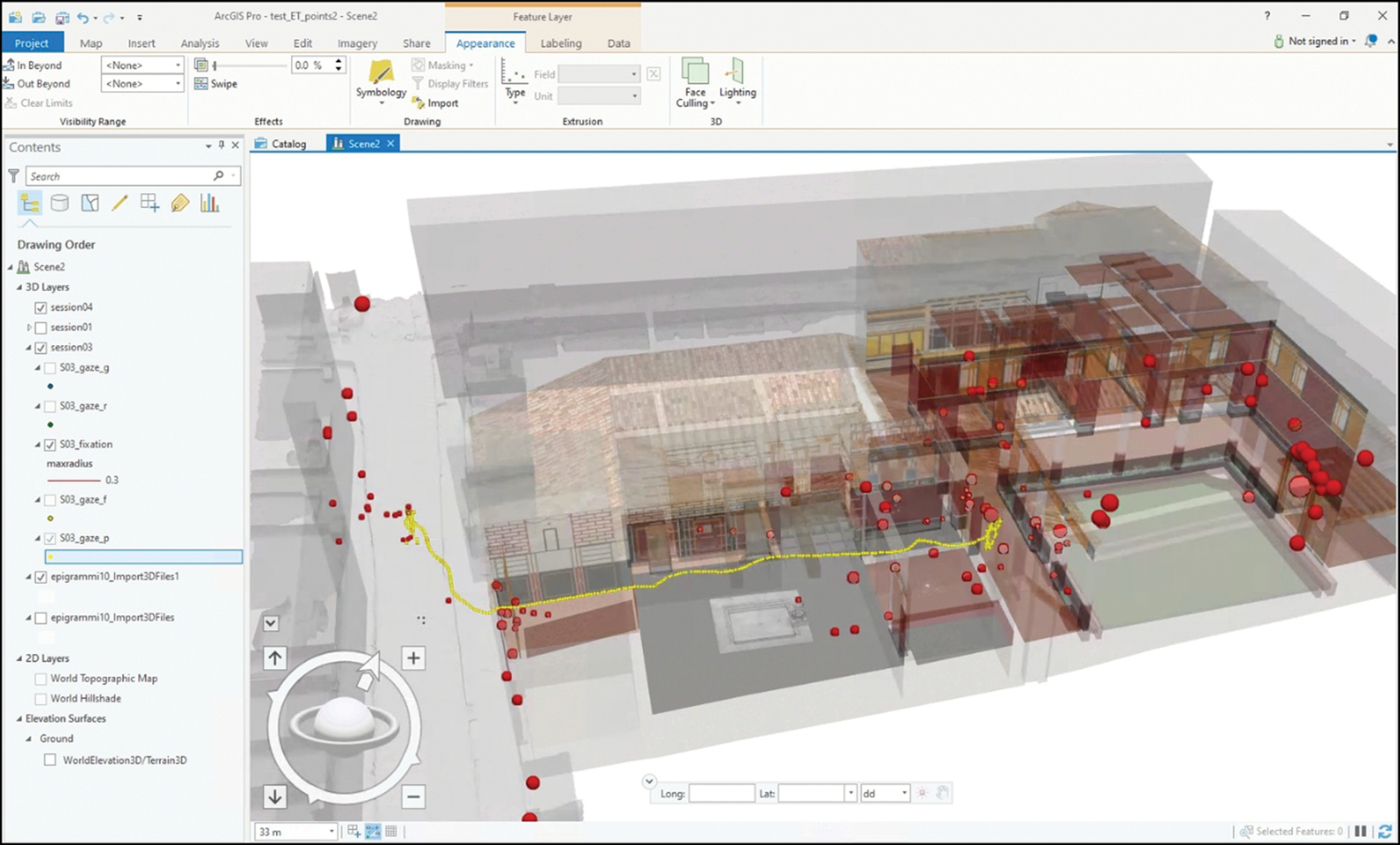It is of paramount importance to geolocate the visual behaviour of a user by integrating the collected 3D data into a GIS environment. Specifically, this process may allow specialists to take advantage of the analytical power offered by this system (e.g. statistical analysis, 3D density maps, line-of-sight, distribution maps, multi-layered analysis) and to investigate data critically against other important layers of information (e.g. light metrics calculated using a lighting simulation tool [Figure 3], audio metrics, graffiti, household artefacts). Information derived from Cognitive3D was imported into a GIS environment (ArcGIS Pro) (Figure 2c) as JSON files—a standard human-readable exchange data format—comprising three datasets: gaze (accurate tracking of the head position of the user); fixation (detailed understanding of what users are focusing on when their eyes are relatively stable, where the stable point is called ‘fixation’); and event (duration, beginning and end of a single session) (Figure 4a). Each point in a dataset is identified by a triplet representing the (x, y, z) values according to the Unity coordinate system. Due to differences in the Unity and ArcGIS coordinate systems, transformation of the Unity coordinates to ArcGIS coordinates was required (Figure 4b). Once created, the datasets were imported as an ASCII file, along with the 3D model used for the simulation in Unity3D. The relative position of the eye tracker-measured points perfectly matched the space in which the users moved virtually while wearing the VR headset (Figures 5 & 6).