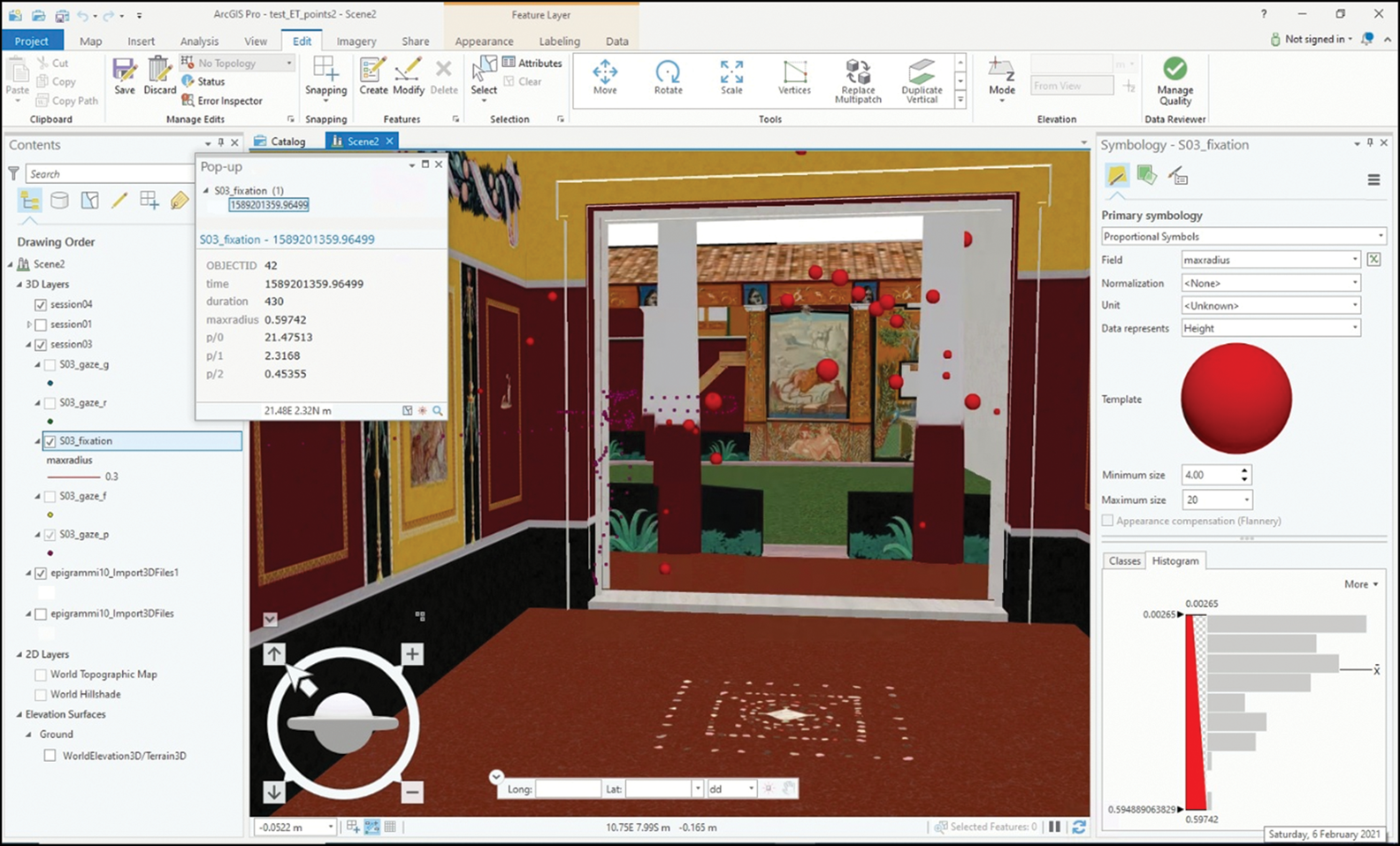 In this trial, users’ visual experiences (gaze, fixation and movement) within a virtually reconstructed Pompeian house have been collected and imported into a GIS environment. Handling virtual reality eye tracker-derived data in a GIS space may present interesting new scenarios for research and analysis of human/environment interaction (e.g. to investigate how illumination influenced the social experience of elements such as graffiti and wall paintings). It is possible to query the geodatabase and automatically select areas with higher levels of visual attention, and to understand in which order objects are seen and the positions taken in the space by the user. Multiple human sessions can be integrated, and a large quantity of data can be managed in order to detect patterns that may relate to particular features of the examined virtual space. Furthermore, by managing these data in 3D GIS, an individual user's experience can be associated with a descriptive record entry (attribute table) and linked to a specific visual attention point, making it easier to combine a quantitative assessment of the visual experience with specific factors such as, for example, user age and lighting conditions.