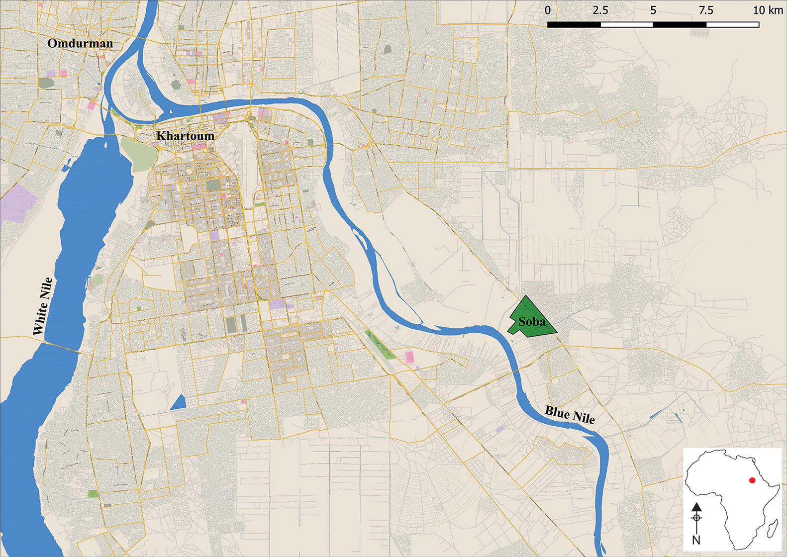 Figure 1. Map of the region in 2020. The green polygon marks the archaeological zone at Soba (prepared by M. Drzewiecki; background: Wikimedia open street map).