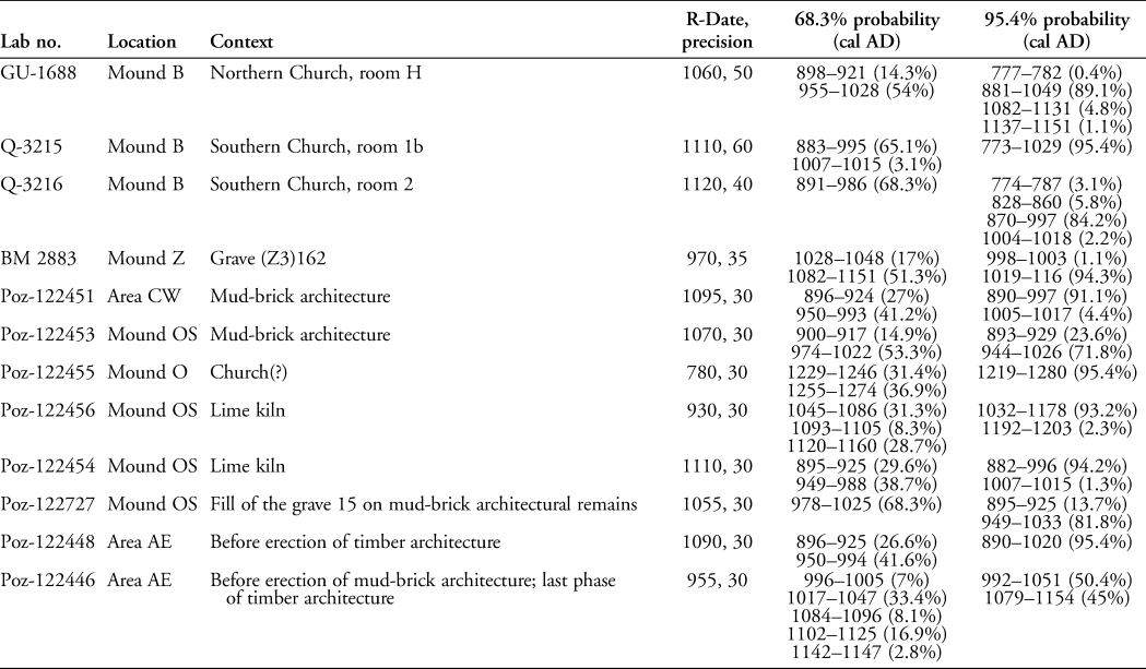 The fabled ‘chaos’ that reigned prior to Soba's final conquest is partly attested in the archaeological record. Welsby (Reference Welsby2002: 255) suggested that the twelfth to thirteenth centuries were the final years of Soba's occupation. By the early thirteenth century, two of the fine churches were already in ruins, as indicated by the small finds assemblage and radiocarbon dates (Table 1: samples GU-1688, Q-3215, Q-3216). The nearby tombs of dignitaries were pillaged, while on Mound Z, a group of late graves was recorded (Table 1: sample BM-2883).