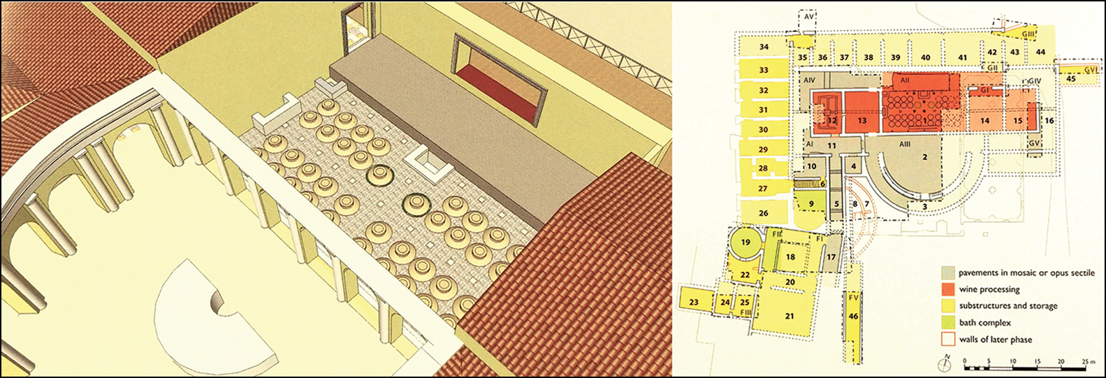 Viniculture, and agriculture more broadly, was central to elite cultural identity in many ancient Mediterranean societies. As early as the third millennium BC, for example, the Egyptians depicted scenes of wine production in tomb paintings and vinicultural origin myths were embedded in Persian culture (Brun Reference Brun2003). Later, the Roman elite, including the imperial family, became fascinated by the theatre of wine production. This is reflected in ancient literature (e.g. Varro, Pliny the Younger), where farming is also presented in agricultural treatises as an allegory for the upkeep of the state, embodying important ideological and political dimensions (Marzano Reference Marzano, Hollander and Howe2021: 432). It is also attested in art (e.g. vintage scenes on sarcophagi; Dodd Reference Dodd2022: 455–56), and, occasionally, archaeologically in the form of highly elaborate facilities at opulent villas. Wealthy Romans cultivated a luxurious notion of rusticity, romanticising the role of the rural worker and celebrating the landowner as commander of nature. Architecturally, this ideology could be expressed through the fusion of utilitarian and elegant elements to create spaces where production was displayed, observed, flaunted and appreciated. In these ways, agricultural production—and winemaking in particular—played a key role in the construction of elite Roman identity.