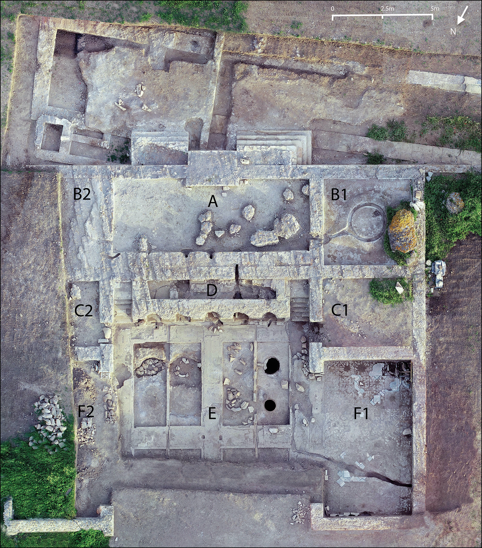 Figure 2. Aerial orthophotograph of the Villa of the Quintilii winery building, indicating the treading area (A), press beds (B1 and B2), proposed press mechanism rooms (C1 and C2), collection vat (D), cella vinaria (E), and dining rooms (F1 and F2) (image by M.C.M s.r.l, modified from Frontoni et al. Reference Frontoni, Galli, Paris, Cecalupo and Erba2020: fig. 3).