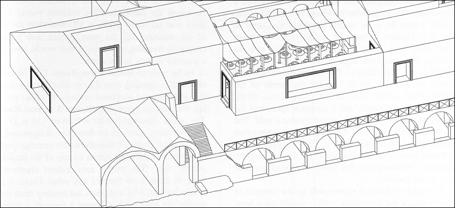 The cella vinaria is surrounded on three sides by rooms that appear to be unrelated to the production process (Figures 1 & 2). On the south-western and north-eastern sides are two identically sized rooms of 9 × 5m (F1–F2 in Figure 2), of which only the former was completely excavated (the third, unexcavated room to the north-west is larger, at 11.5 × 9m). These rooms feature wide entrances, extending almost the entire length of each room, opening directly onto the cella at the same level. Such wide entrances will have provided an expansive view of the interior of the complex and, depending on precise position, allowed glimpses of almost all the production stages (Figure 8). The larger, unexcavated room at the north-western end, if it is of the same design and purpose, will have possessed a commanding longitudinal view of the entire facility (like the banqueting exedra at Villa Magna: Fentress et al. Reference Fentress2016: 90–100, with pls. 5.5 & 5.12). All three rooms were interconnected via the cross-shaped walkway across the cella vinaria and could only be accessed from this central space (Figures 2 & 3).