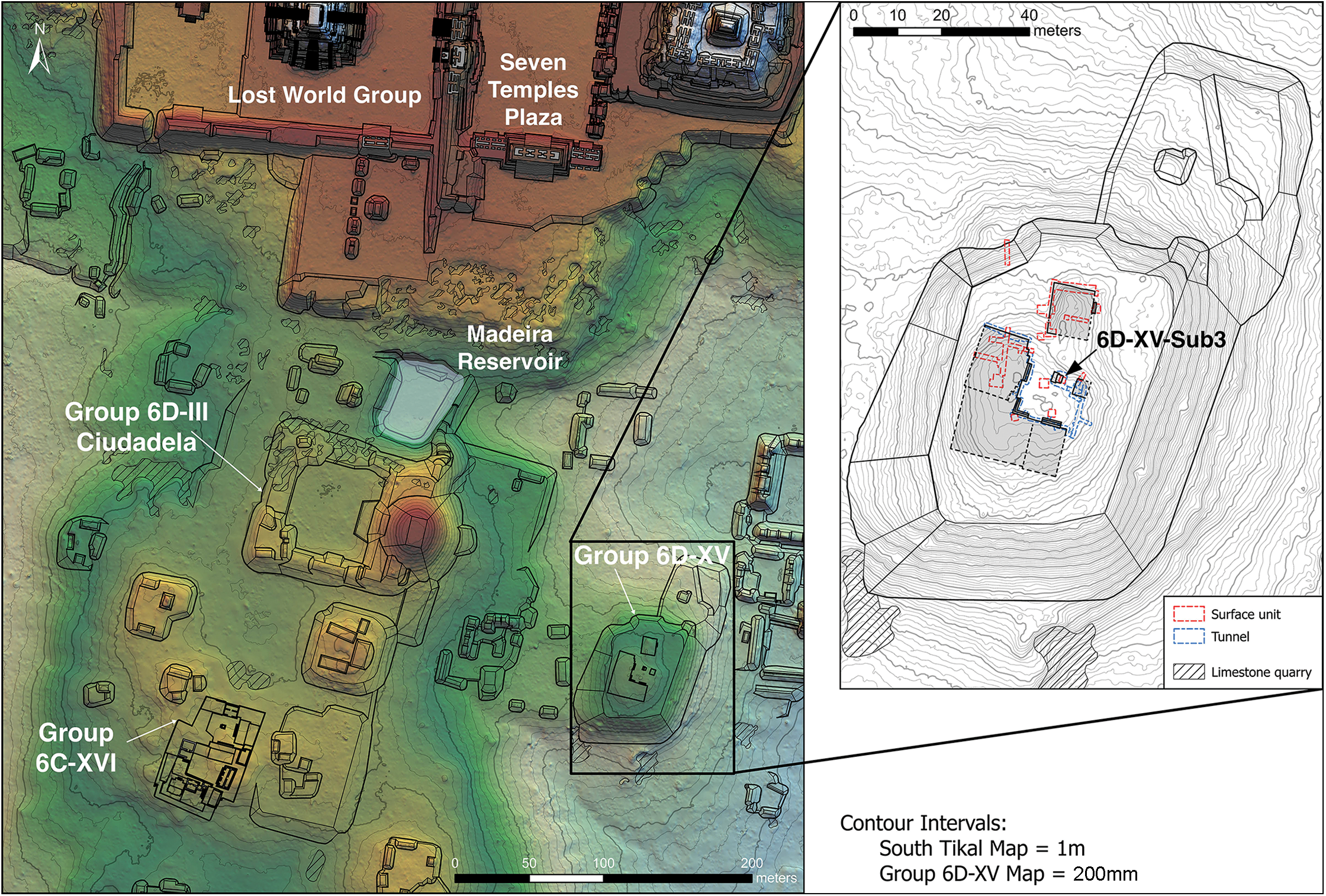 Beginning in 2019, prompted by fresh results from lidar, the excavations at Group 6D-XV ultimately revealed a painted altar (Structure 6D-XV-Sub3) at the centre of a patio marked by various construction episodes and associated burials or caches (PAST-Burials 7, 11, 10 and 15). Group 6D-XV lies atop a natural rise levelled to create a larger platform (Figure 2); located 125m east of the 6D-105 pyramid, this group shares an orientation with Group 6D-III, constructed parallel to its platform. Like the occupation and termination of Group 6C-XVI (Laporte Reference Laporte and de la Garza y Camino1987, Reference Laporte1989; Laporte & Fialko Reference Laporte and Fialko1995), Group 6D-XV revealed a residential patio compound that was buried as part of the termination of Tikal's southern sector.