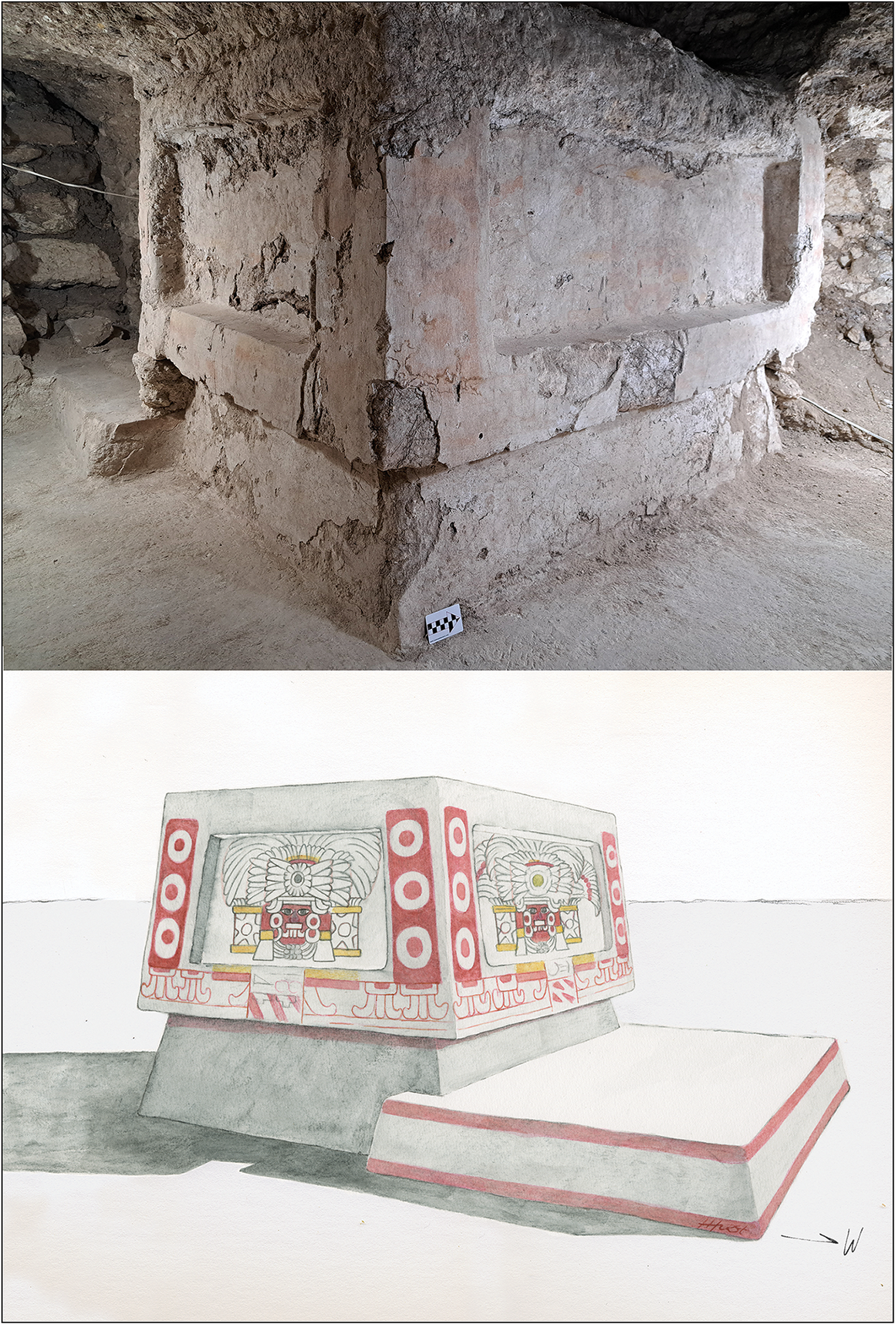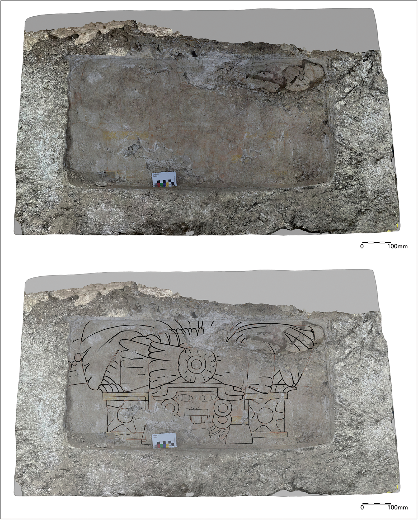 Figure 5. Structure 6D-XV-Sub3, altar with murals photographed from the south-west (above) and rendered from the north-west (below) (photograph by E. Román; rendering by H. Hurst).