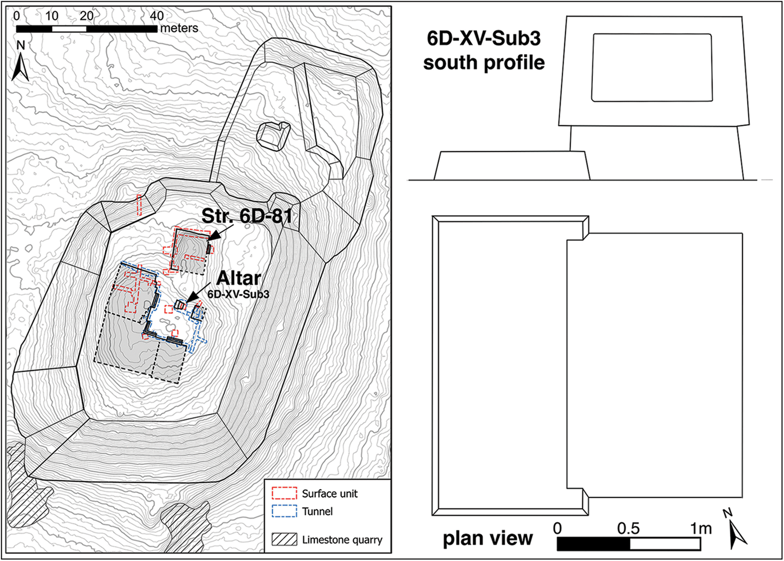 Figure 2. Architectural group 6D-XV, tunnels correspond to the level of Structure 6D-XV-Sub3, showing the location (left) and a schematic representation (right) of the murals altar (image by T.G. Garrison, H. Hurst & L. Paiz).