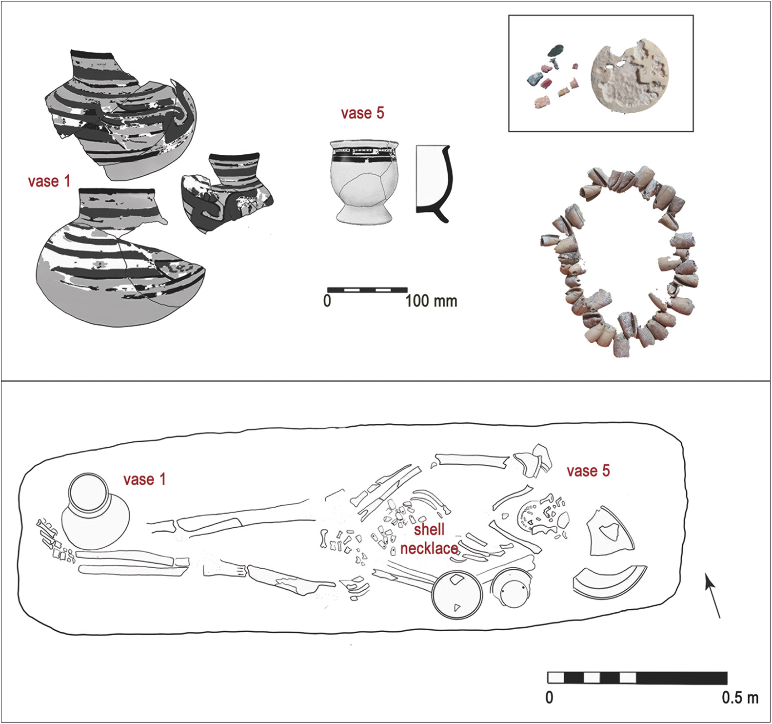 The earliest phase of Group 6D-XV is represented by an ovoid arrangement of post holes on the eastern side of the mound, 11m beneath the current surface (Figures S15 & S17). Two atypical interments occur in association with what was probably a structure made from perishable material. PAST-Burial 10, a tomb with limestone walls, stuccoed floor and a thick ash stain above it, contained a supine skeleton of a probable male adult, arranged with hands crossed over the hips, head facing east (Figure 3, see also OSM). Among the grave goods was a stemmed biface of obsidian (Figure S13a) and a fragmentary biface of green obsidian, an object closely tied to Teotihuacan in both form and material, was in the fill directly above the burial (Figure S13b; cf. Haviland Reference Haviland2014: 415). Other funerary goods underscore the high status of the deceased, including a rich inventory of two shell needles, a shell earflare with a stone mosaic, 36 stuccoed Oliva shells, 54 shell beads, a grinding stone and several ceramic vessels. Two vessels were of local make but anomalous in shape, including a cream-coloured chalice resembling Late Tlamimlolpa goblet shapes and a slipped vessel with the image of a macaw (cf. Rattray Reference Rattray1992: pl. XIX).