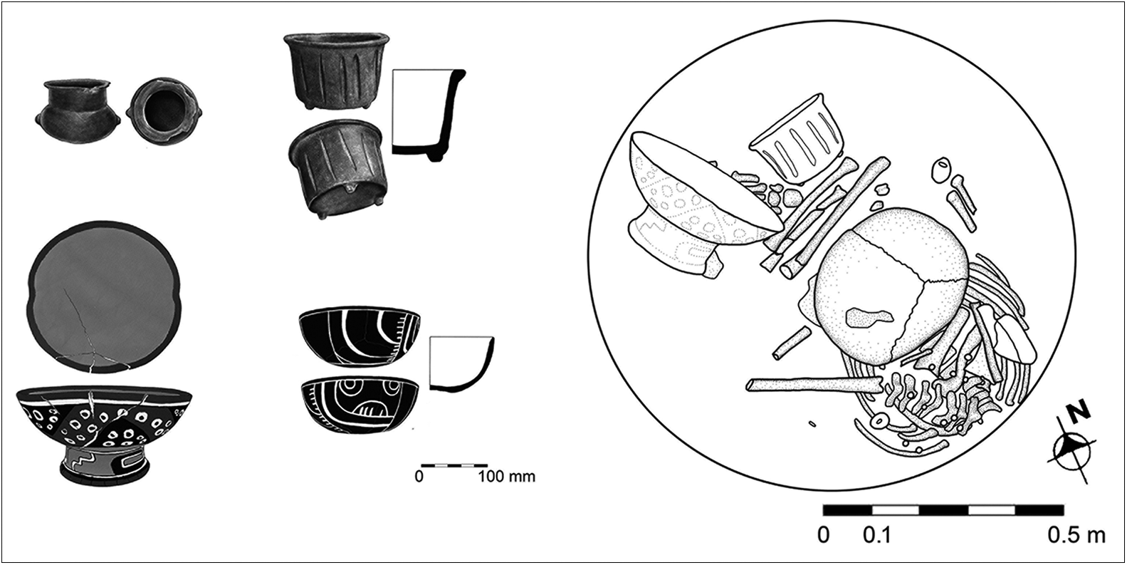 Figure 4. Four ceramic vessels found in PAST-Burial 15 and a plan view of the burial (right). The upper-left and lower-right vessels were found beneath the pots illustrated on the plan (drawings by H. Hurst & S. Levine).