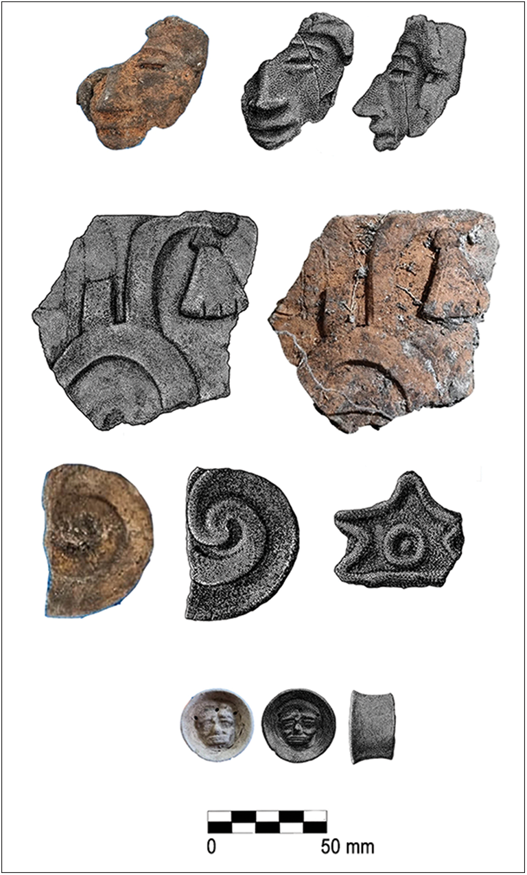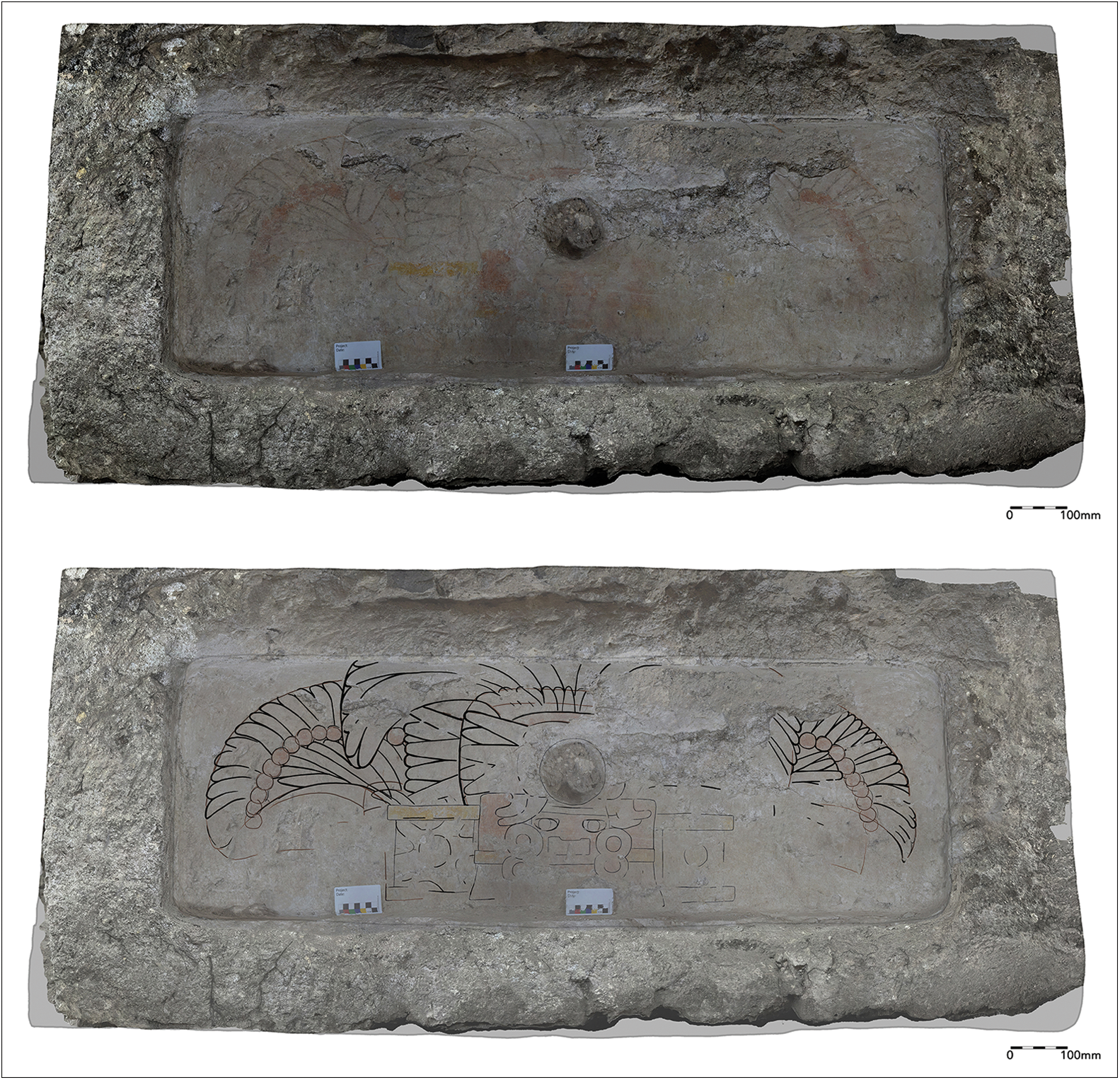 The courtyard altar (Structure 6D-XV-Sub3) employs masonry talud-tableros, covered by earthen and lime-based layers and finished with multiple coats of fine lime plaster (Figures 5, 7–10). The extended platform providing access on the west and the talud element of the altar were simply demarcated with thick red lines. The four tablero surfaces of the altar, including the frame and recessed panel of each side, were painted in red, orange, yellow and black hues (see OSM for details). Each recessed panel displays the frontal image of a person wearing a feathered headdress. Only the face and headdress are shown, and flanking elements may represent shields or other elements of regalia. Preservation of the plaster and the images is variable on each side, though overall the designs are faint and the plaster is friable. Application of photogrammetry, and processing of the high-resolution orthomosaic images with dStretch software, has aided the documentation and study of the painted panels. The dStretch digital imaging tool, initially designed for enhancing rock art, uses a decorrelation stretch algorithm to create various false colour images by increasing differences in hue (Harman Reference Harman2005). Red and yellow hues were detected in the Tikal altar paintings, which were then verified and incorporated into on-site drawings of the tableros, thereby confirming unclear details (Figure S11).