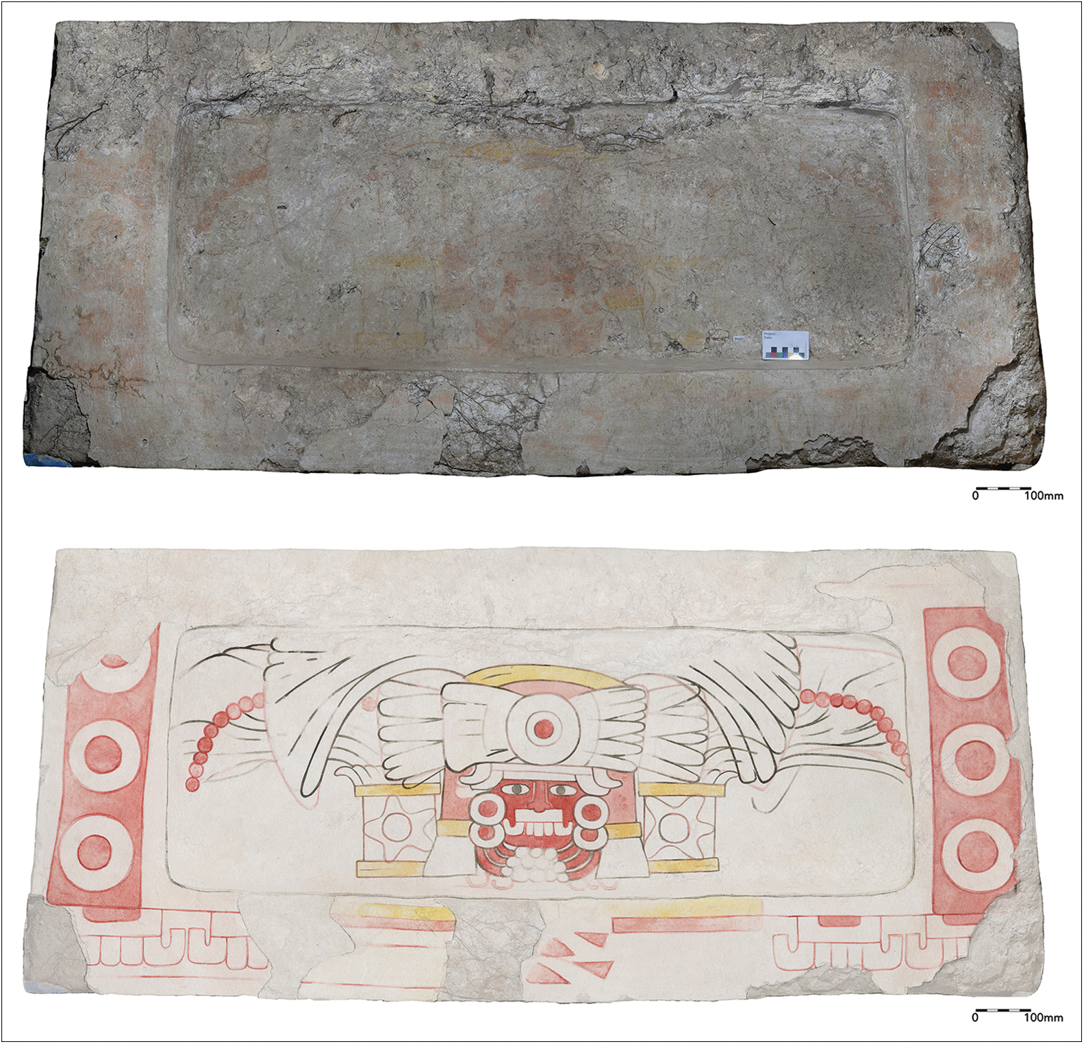 Close visual examination and separated colour data from the Tikal altar also disclose the layered brushstrokes of the fresco secco technique (see OSM for detail). The Tikal altar adheres closely to Teotihuacan mural painting style and technique in its use of a pale red underpainting sketch, flat colour fields and red contour lines on the figure, shields and frame (cf. Magaloni Reference Magaloni and de la Fuente1996, Reference Magaloni and Robb2017; Conides Reference Conides2018). The deliberate spacing in feather layout, the rendering of even contour lines and the final feathered-panel outline all depart from calligraphic lowland Maya painting of feathers (e.g. Bonampak, Structure 1, Room 1 headdresses), resembling more the plumage on the frontal figure of Tetitla Portico 11 (de la Fuente Reference de la Fuente and de la Fuente1995: pl. 45) and the Conjunto del Sol, among other Teotihuacan artworks. The mixture of red and black contour lines of the Tikal altar diverges from most Teotihuacan wall paintings, yet it is a technique evident on stuccoed vessels found at that city (Conides Reference Conides2018: 190). In addition to the imagery itself, these technical elements demonstrate that the altar murals were made by people well-versed in highly standardised Teotihuacan painting.