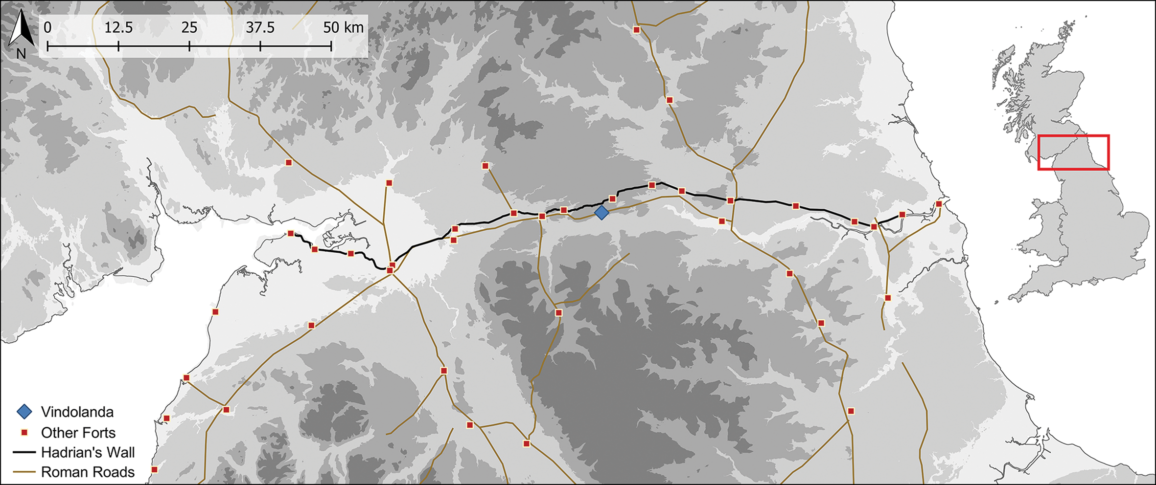 Figure 1. Location of Vindolanda Roman fort (map by K. Murphy, Newcastle University, using Hadrian's Wall GIS datasets (Garland Reference Garland2020a, Reference Garland2020b, Reference Garland2020c)).