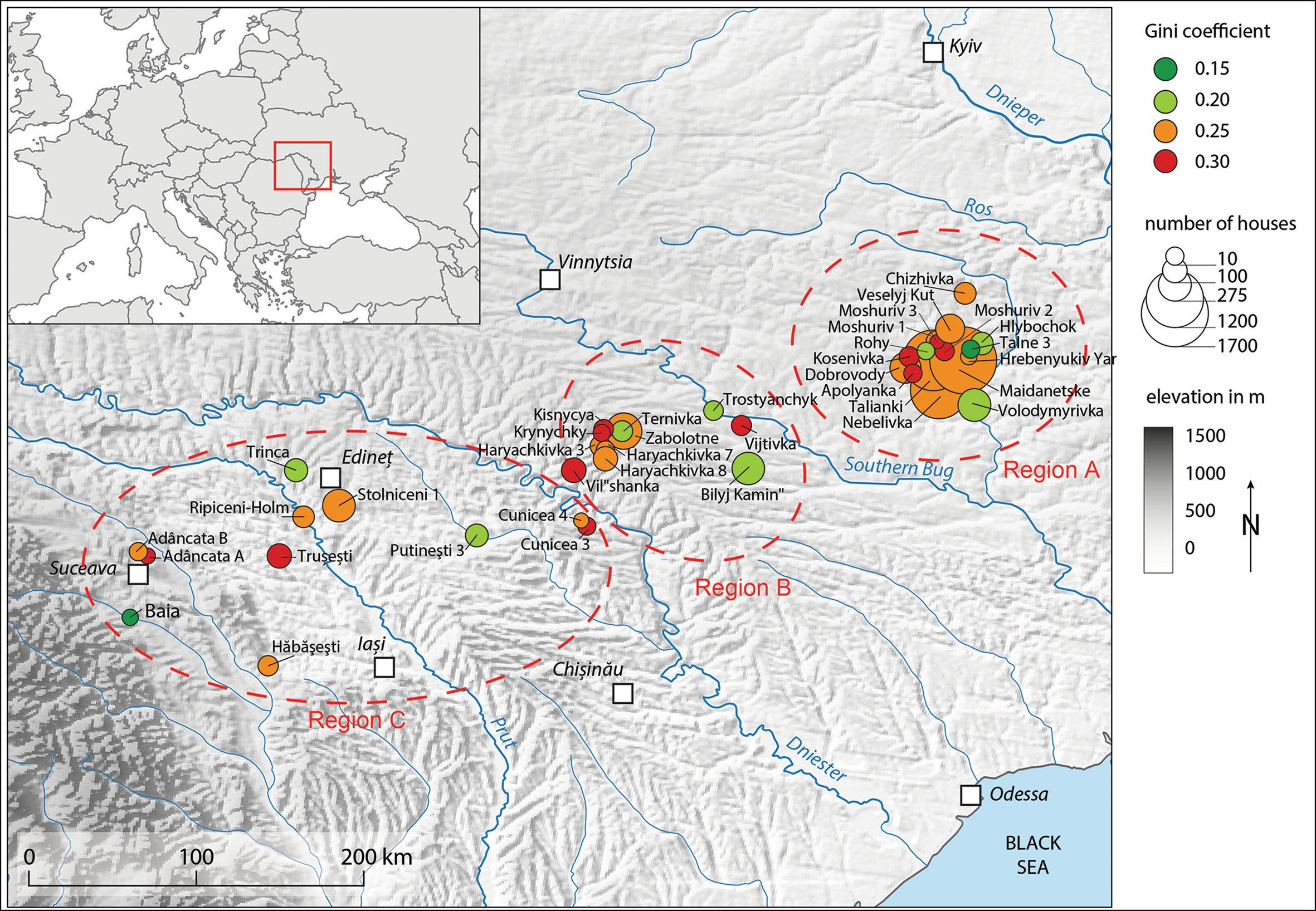 We therefore believe we can partially answer the frequently discussed question of why Trypillia mega-sites emerged. The mega-site concept included a levelling mechanism to prevent social inequality, with co-operative economic management and living arrangements used to minimise inequality. The Gini coefficients generated here show that this was successful for a long time. Only during the later development phase of the mega-sites, from c. 3800 BC onwards, did the tendency towards social inequality increase again. Thus, the mega-site phenomenon represents one of a series of historical examples that show that an increase in the complexity of societies is not necessarily associated with an increase in vertical social differentiation. Rather, both the emergence and the break-up of aggregated Trypillia mega-sites were primarily due to the political decisions made by the individuals and communities who lived at—and who eventually decided to leave—these vast settlements.