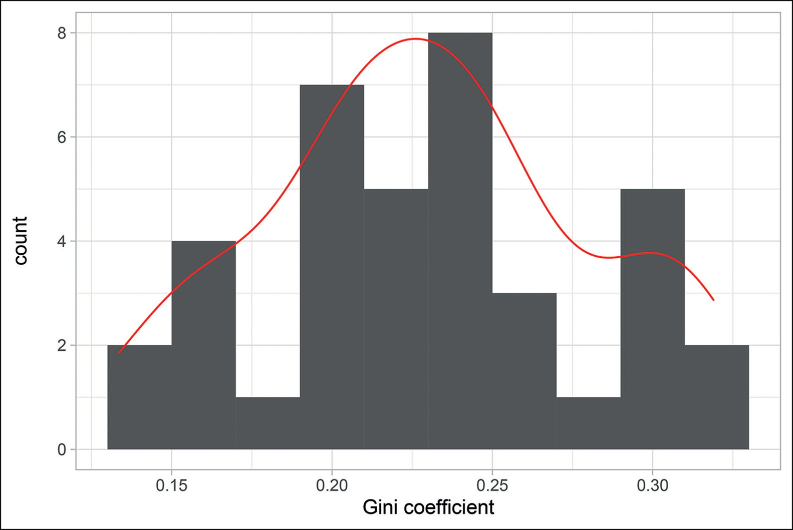 Figure 3. Distribution of Gini coefficients in the combined sample of sites (bin width = 0.02) (figure by authors).