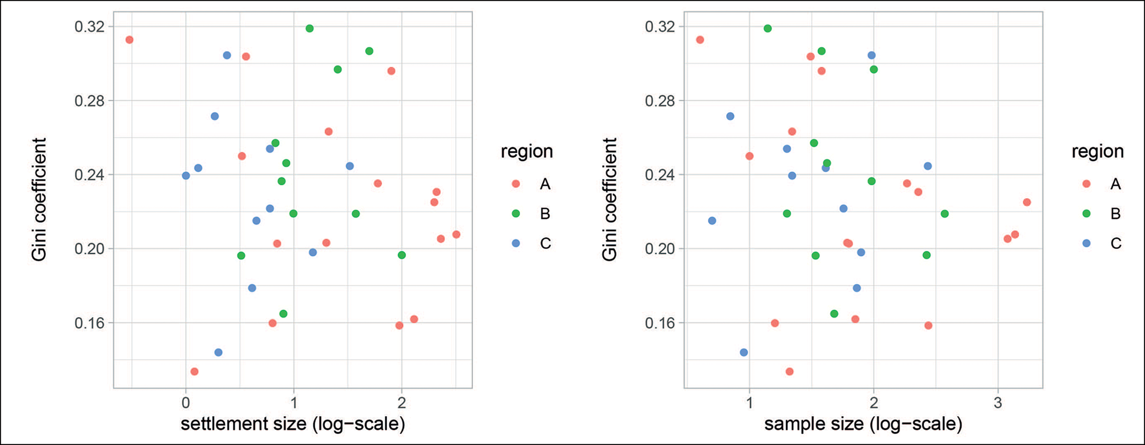 Figure 4. Gini coefficients in relation to settlement size and sample size (figure by authors).