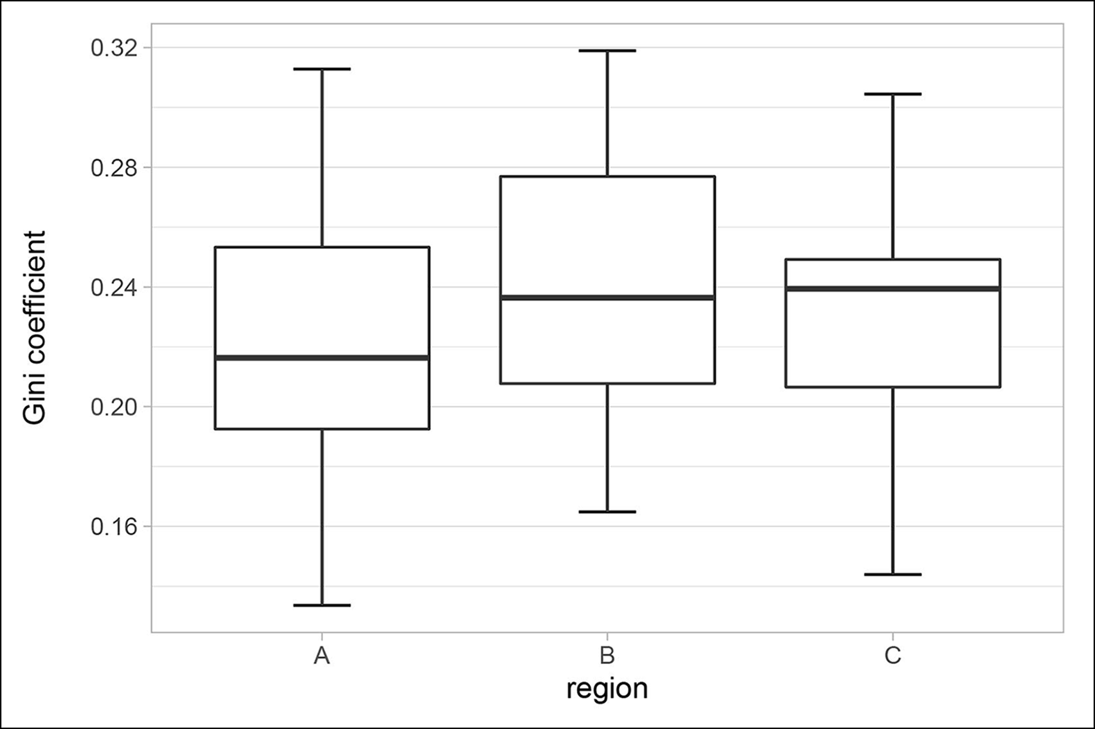Figure 5. Boxplots of Gini coefficients in regions A–C. The whiskers extend to 1.5 of the interquartile range; there are no outliers (figure by authors).