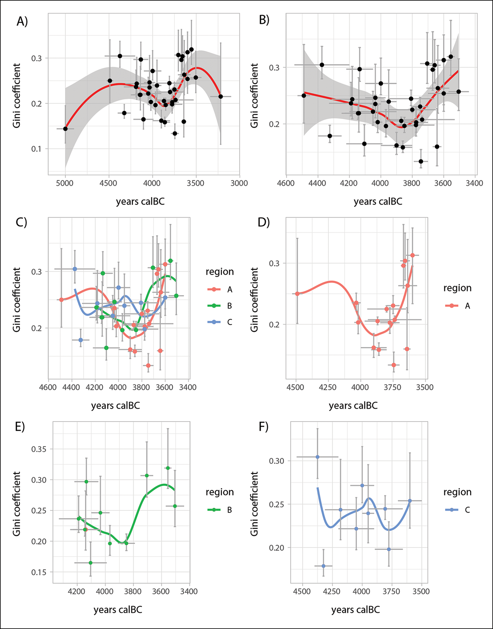Figure 6. Gini values and confidence intervals for Trypillia sites across time. A–C show results from all regions; D–F show individual regions. Red, green and blue lines: locally weighted smoothing regression (LOESS), for A–B with 0.95 confidence band. Vertical bars: 0.8 confidence intervals for Gini values after bootstrapping. Horizontal bars: dating ranges of individual sites (highest probability) (figure by authors).
