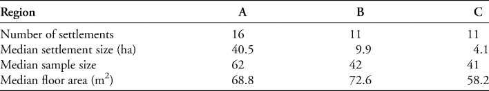 The Gini coefficients do not appear to be related either to overall settlement size or the number of houses within each settlement (Figure 4). Fitting the log-values of settlement size to the respective Gini coefficients yields non-significant p-values for each of the three regions (p-values: 0.4129, 0.5161, 0.768). Note, however, that the largest sites tend to exhibit Gini coefficients that are close to the mean of the overall distribution.