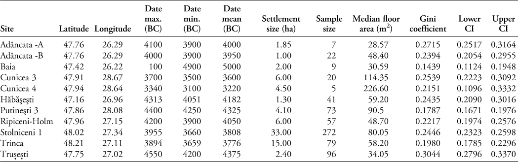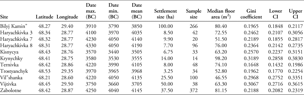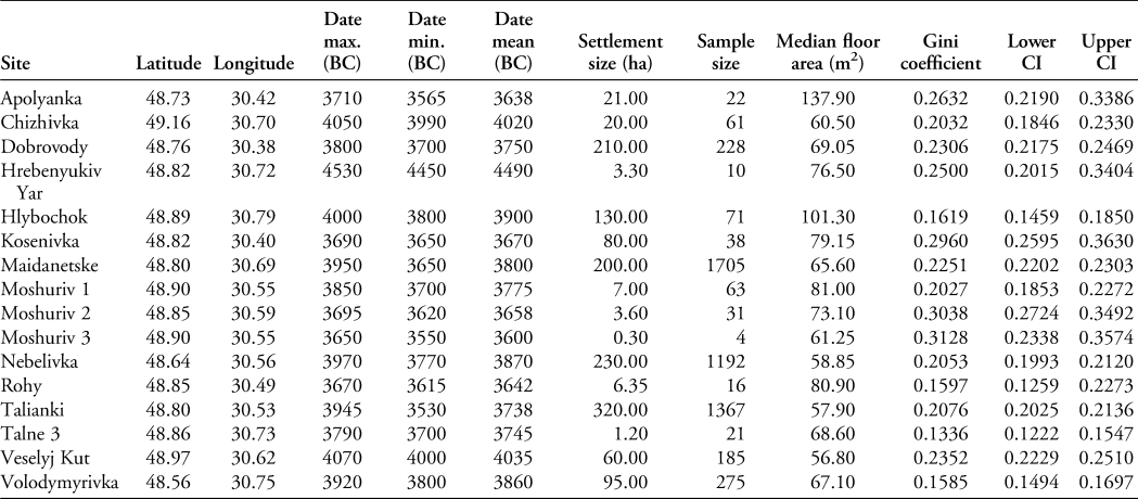 In our view, the social fabric plays a crucial role in explaining the rise and fall of these mega-sites, as it regulates processes of political decision-making and the distribution of surpluses. Are there differences in wealth between households in the mega-sites and in the sequence of Trypillia settlements in general? Based on the results of extensive excavations and geophysical surveys, this article calculates Gini coefficients—a statistical measure of inequality in the distribution of household income—of house floor sizes, which have been shown to be a suitable proxy for evaluating household variability in diverse cultural contexts and in global comparative studies (e.g. Kohler et al. Reference Kohler2017; Thompson et al. Reference Thompson, Feinman and Prufer2021; Basri & Lawrence Reference Basri and Lawrence2020).