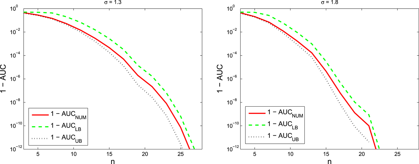 $(1-\hbox{AUC})$ and its bounds rapidly go to 0 which means that AUC goes to one as we increase the number of nodes, n, in the graph. More precisely, bounds for