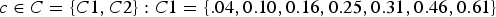 $c \in C = \{C1, C2\}: C1 = \{.04, 0.10, 0.16, 0.25, 0.31, 0.46, 0.61\}$