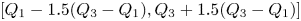 , and the whiskers show the maximum and the minimum values in the range of $[Q_1 - 1.5(Q_3 - Q_1), Q_3 + 1.5(Q_3 - Q_1)]$