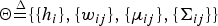 ${\bf \Theta} {\mathop{=}\limits^{\Delta}} \{ \{h_{i}\}, \{w_{ij}\}, \{{{\bf \mu}}_{ij}\}, \{{\bf \Sigma}_{ij}\} \}$
