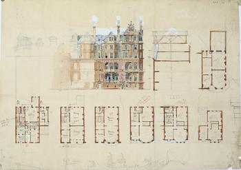 Fig. 4. E.W. Godwin, preliminary designs for houses for Messrs. Gillow, 4–6 Chelsea Embankment, London, 1877; pencil and coloured wash (courtesy Royal Institute of British Architects, British Architectural Library Drawings Collection, ref. 12563)