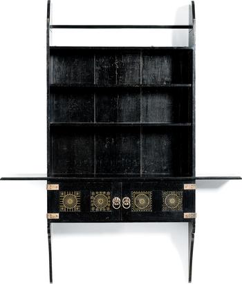 Fig. 8. E.W. Godwin, hanging bookcase, c. 1875; made by William Watt & Co; ebonised mahogany, stencilled decoration and silver hinges (© Sotheby's, London)