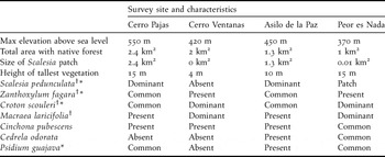 Table 1. Description of vegetation found at each of the four survey sites. The total area with native forest is regarded as any forested area dominated by native tree species. We have noted the occurrence of seven of the most common dominant highland plant species across sites in the following descending order of abundance: (1) Dominant, (2) Common, (3) Patch (common, but only within a specified area in km2), (4) Present, (5) Absent. Site sizes were calculated using Google Earth ProTM.