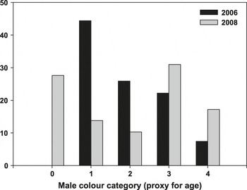Figure 2. Change in the percentage of male colour categories at active Medium Tree Finch nests in the Floreana highlands between 2006 and 2008. Note that there were no Black 0 (young) males in 2006, which suggests unsuccessful breeding in the previous year(s). No Black 5 (old) males were observed in either study year.