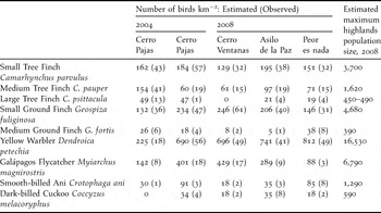 Table 2. Population density estimates for bird species surveyed at Floreana Island highland forest sites in 2004 and 2008. Methods for calculating density are detailed in the methods section. The maximum population size for 2008 was calculated using the mean density (birds km−2) across the four sites divided by the total area of native forest (22.5 km2). For the Large Tree Finch, a range in population size was calculated (see results, Cerro Ventanas was excluded from the lower estimate). The inflection point (distance from the observer at which the density of each species declined) was 70 m for each of the five species of Darwin’s finches, 50 m for the Smooth-billed Ani and Dark-billed Cuckoo, 40 m for the Yellow Warbler, and 30 m for the Galápagos Flycatcher.