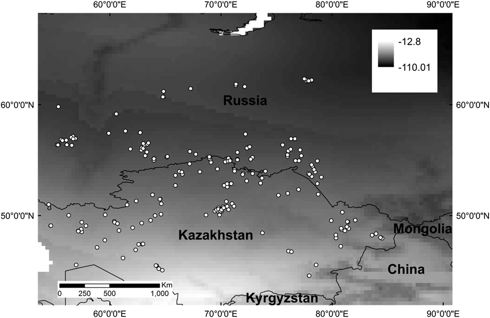 Conservationists need to know the distribution of species if they are to monitor populations and initiate management to reverse declines, yet the distributions of rare species are often poorly known. The Slender-billed Curlew Numenius tenuirostris illustrates this latter situation. It is ‘Critically Endangered’, with an estimated population of < 50 individuals (BirdLife International 2015a). The last irrefutable sighting came from Morocco in 1995, in the birds wintering range (Buchanan et al. Reference Buchanan, Crockford and Gretton2010), whilst intensive surveys of passage and wintering areas between 2009 and 2014 have failed to find any birds (Crockford and Buchanan in press). Historical records show that the species formerly wintered across the Mediterranean basin, especially in Italy, and along the Atlantic coast of Morocco (e.g. summaries in Cramp and Simmons Reference Cramp and Simmons1983, Gretton Reference Gretton1991). It appears to have passed through the Caspian and Black Sea areas in spring and autumn (Cramp and Simmons Reference Cramp and Simmons1983, Gretton Reference Gretton1991). The only definite breeding records concern a small number of nests in raised bogs near the village of Krasnoperova c.10 km south of Tara, Omsk province, Russia (55.00°N, 73.35°E), during the first quarter of the 20th century (Ushakov Reference Ushakov1916, Reference Ushakov1925). The habitat in this area was a mix of raised bogs and forest (Ushakov Reference Ushakov1912, Reference Ushakov1916, Reference Ushakov1925), typical of the forest-steppe and hemi-boreal forest ecoregions of Western Siberia (Olson et al. Reference Olson, Dinerstein, Wikramanayake, Burgess, Powell, Underwood, D’Amico, Itoua, Strand, Morrison, Loucks, Allnutt, Ricketts, Kura, Lamoreux, Wettengel, Hedao and Kassem2001). Others (e.g. Belik Reference Belik1994) have suggested the species might breed on the steppe of southern Russia and northern Kazakhstan (the Kazakh steppe ecoregion of Olson et al. Reference Olson, Dinerstein, Wikramanayake, Burgess, Powell, Underwood, D’Amico, Itoua, Strand, Morrison, Loucks, Allnutt, Ricketts, Kura, Lamoreux, Wettengel, Hedao and Kassem2001) or in a broad band encompassing aspects of both habitats (e.g. Kozlova Reference Kozlova1962 in Cramp and Simmons Reference Cramp and Simmons1983). None of the breeding reports, whether putative or confirmed, come from west of the Ural mountains (Gretton Reference Gretton1991). This supports the suggestion of Bannikov (1978, in Cramp and Simmons Reference Cramp and Simmons1983), that the breeding range lay east of the Urals.