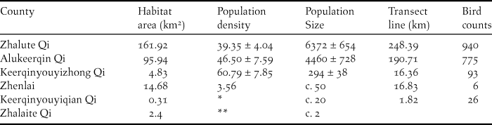 The area of suitable breeding habitat for Jankowski’s Bunting is approximately 280 km2, as determined by remote sensing (Figure 2). The estimated population size in China ranges between 9,800 and 12,500 individuals. The currently known populations of Jankowski’s Bunting are scattered within the scope of 16 towns in six counties/cities. The population and habitat sizes at Zhalute Qi were the largest, followed by Alukeerqin Qi and Keerqinyouyizhong Qi (Table 1).