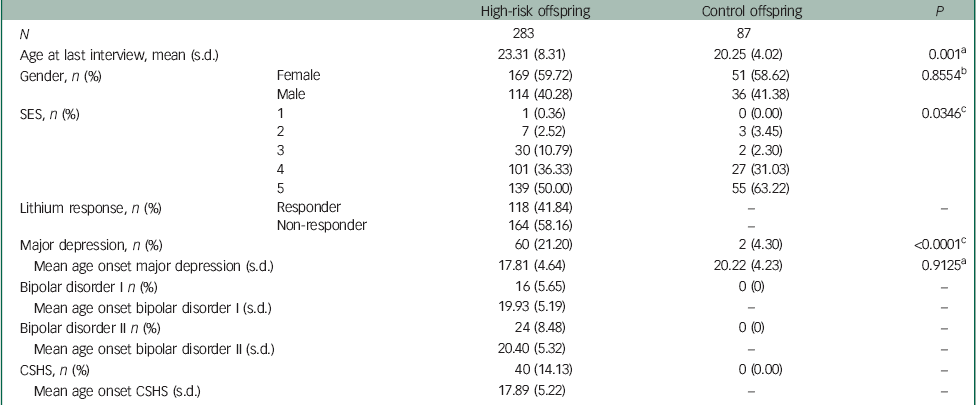CSHS, clinical significant sub-threshold hypomanic symptoms; s.d., standard deviation; SES, socio-economic status.