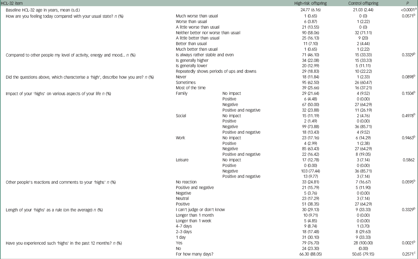 Consenting high-risk and control offspring were clinically assessed annually by a child and adolescent psychiatrist specialising in mood disorders using the Kiddie-SADS-PLReference Axelson, Birmaher, Brent, Wassick, Hoover and Bridge 29 semi-structured interview. As part of the semi-structured interview, sub-threshold hypomanic symptoms were systematically documented. The operationalised criteria to confirm CSHS included (1) participant endorsed a minimum of three DSM-IV hypomanic symptoms, but did not meet full DSM-IV criteria for hypomania or bipolar disorder not otherwise specified episode based on duration or severity; (2) symptoms represented a clear change from normal functioning, endorsed by self and others that knew the person well; and (3) no evidence of major impairment. All diagnoses (including CSHS) in high-risk and control offspring were confirmed by a blind consensus review with at least two additional psychiatrists. As part of the high-risk study, during each annual research assessment remitted or well offspring completed the HCL-32.Reference Angst, Adolfsson, Benazzi, Gamma, Hantouche and Meyer 30 Parents completed the Hollingshead socio-economic status (SES) scale,Reference Hollingshead 31 which is a validated measure of SES comprising a composite score of both working spouses highest achieved education and occupation. This research was approved by the local Independent Research Ethics Board in Ottawa, Ontario.