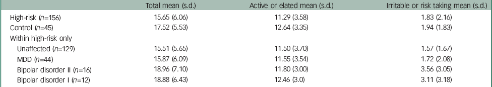 The HCL-32Reference Angst, Adolfsson, Benazzi, Gamma, Hantouche and Meyer 30 is a 32-item self-report questionnaire originally designed to assess hypomanic symptoms among patients with MDD. A score of 14 or more is considered a clinically significant level of bipolar symptoms and cut-offs of >12 and >3 have been established for active or elated and irritable or risk-taking subscales, respectively.Reference Angst, Adolfsson, Benazzi, Gamma, Hantouche and Meyer 30 The HCL-32 has been well validated in clinical populations,Reference Angst, Adolfsson, Benazzi, Gamma, Hantouche and Meyer 30 , Reference Meyer, Schrader, Ridley and Lex 32 with coefficients alpha ranging between 0.8 and 0.9.Reference Meyer, Schrader, Ridley and Lex 32 For this analysis, owing to the age cut-off of the HCL-32, only high-risk and control offspring aged 15 years and over were included.