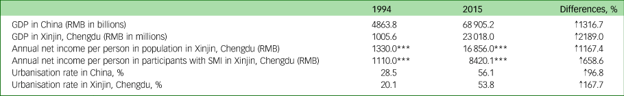 Table 1 shows the socioeconomic status and urbanisation rate from 1994 to 2015. GDP in China and Xinjin, Chengdu from 1994 to 2015 has increased 1416.7% and 2289.0%, respectively. The urbanisation rate in Xinjin increased from 20.1% in 1994 to 53.8% in 2015, which is similar to the China average. Compared with the annual net income per person in the population in Xinjin, Chengdu, the annual net income per person in participants with SMI was significantly lower in both 1994 and 2015 (P<0.001), and the rate of different annual net income per person between the population and participants with SMI was 19.8% in 1994 and 100.2% in 2015, respectively (Fig. 2). The rate of poor family economic status (less than mean level) was significantly higher in 2015 (65.2%) than that in 1994 (48.2%) (P<0.001) (Table 2).