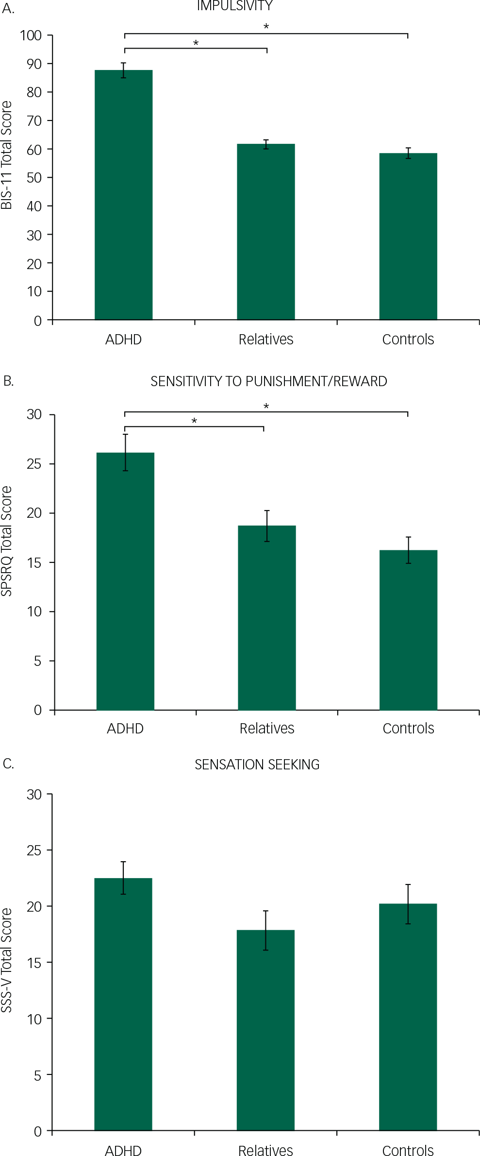 Fig. 1 Panel A: Overall impulsivity score according to BIS-11. Individuals with ADHD showed higher impulsivity than relatives and controls. Panel B: Sensitivity to reward and sensitivity to punishment overall score according to SPSRQ. The ADHD group scored significantly higher than relatives and controls. Panel C: Sensation seeking overall score according to SSS-V. *For significant differences. Bars represent standard error of the mean.