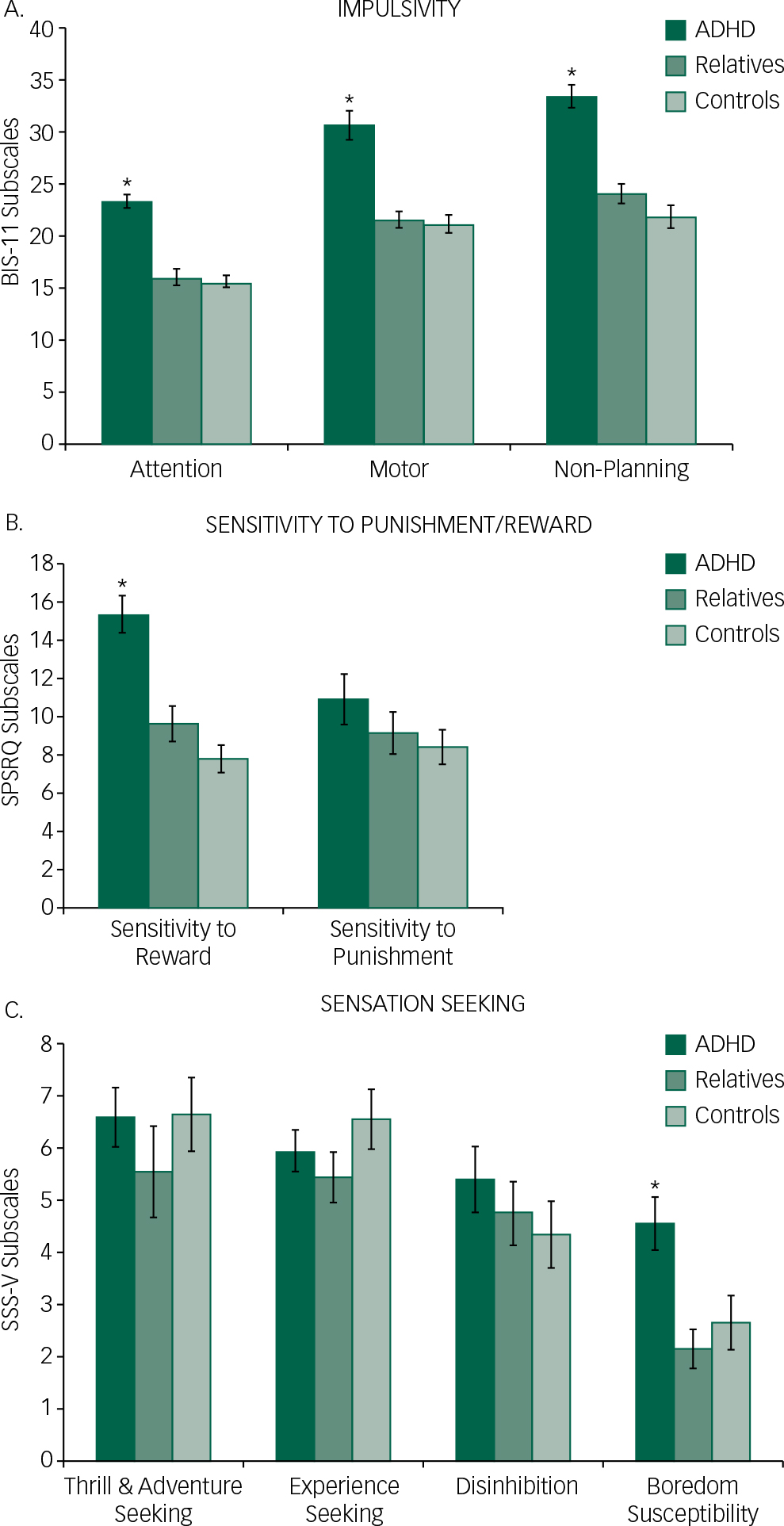 Fig. 2 Panel A: Impulsive traits according to BIS-11 subscales. Individuals with ADHD showed higher impulsive traits on all three subscales. Panel B: Sensitivity to reward and sensitivity to punishment. The ADHD group scored significantly higher than relatives and controls only on the SPSRQ Sensitivity to Reward subscale. Panel C: Sensation seeking subscales according to group. The ADHD group scores significantly higher than relatives and controls only on boredom susceptibility. *For significant differences. Bars represent standard error of the mean.