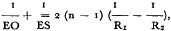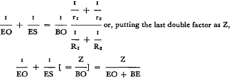 where n is the refractive index of the mirror's glass coating, and R1, R2 its two radii. The second condition is expressed by 1/ES + 1/ER = 2/R2, while the refraction of the parallel ray at the primary lens gives 1/BO = (n — 1) (1/r1 + 1/r2), where r1, r2 are the radii of its convex faces, and its refractive index is assumed to be the same as that of the mirror's glass coating. Substituting (n — 1) gives