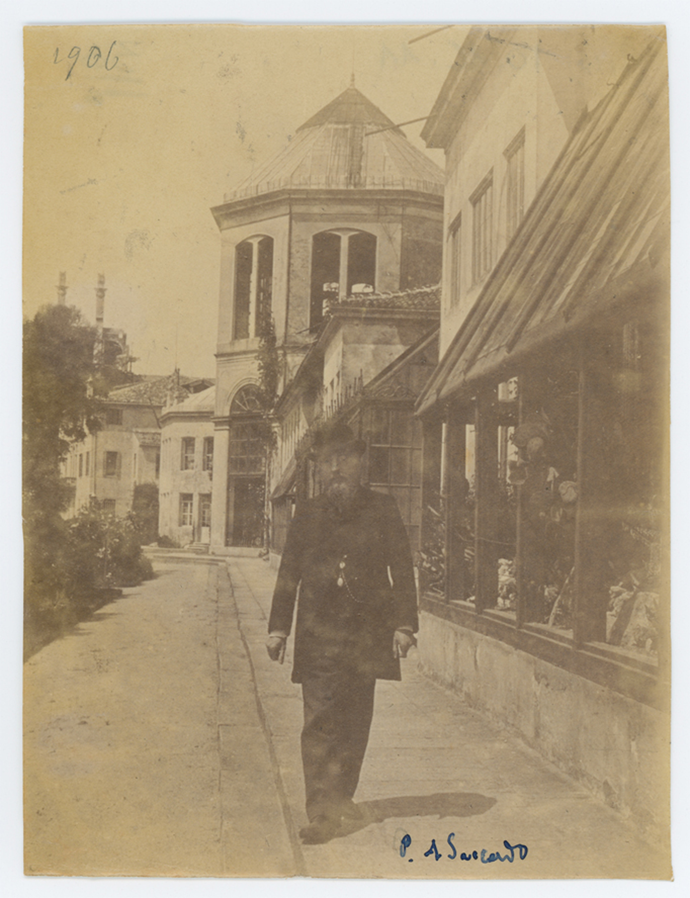 Figure 1. Pier Andrea Saccardo walking in front of the Orto Botanico di Padova, 1906, albumen silver print, Gallery of the Botanical Gardens, PHAIDRA Digital Collections, Università di Padova - Biblioteca dell'Orto botanico.