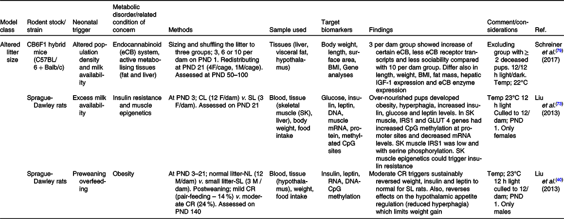 Modifications in pup diet and other direct neonatal experiences can programme the development of adult metabolic phenotypes. Consequently, investigators commonly adopt the model of altered lactational condition of the pup to test for metabolic phenotypes(Reference Ribeiro, Tófolo and Martins84,Reference Otani, Mori and Koyama98,Reference Kaczmarek, Mendoza and Kozak101,Reference Rincel, Lépinay and Delage102) and examine prophylactic agents which may protect from adversities of later life(Reference Ibrahim, Chivandi and Mojiminiyi42,Reference Gumede, Lembede and Nkomozepi61,Reference Serrano, Asnani-Kishnani and Couturier75,Reference Muhammad, Lembede and Erlwanger103,Reference Nyakudya, Isaiah and Ayeleso104) . Here we highlight models that employ diet, maternal separation, photic experience or cigarette smoking in the investigation of neonatal programming (see Table 3).